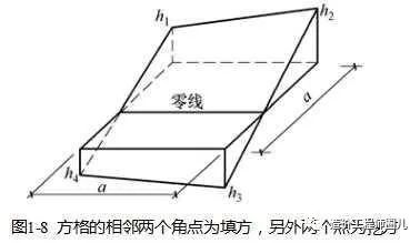 方格的相邻两个角点为填方,另外两个点为挖方,如图1-8所示。