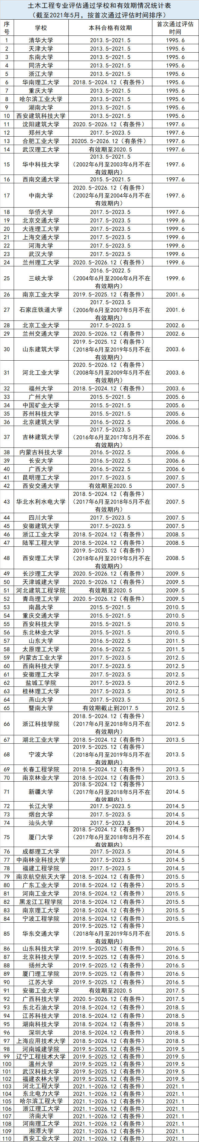 3、 土木工程专业评估通过学校和有效期情况统计表(截至2021年5月,按首次通过评估时间排序)