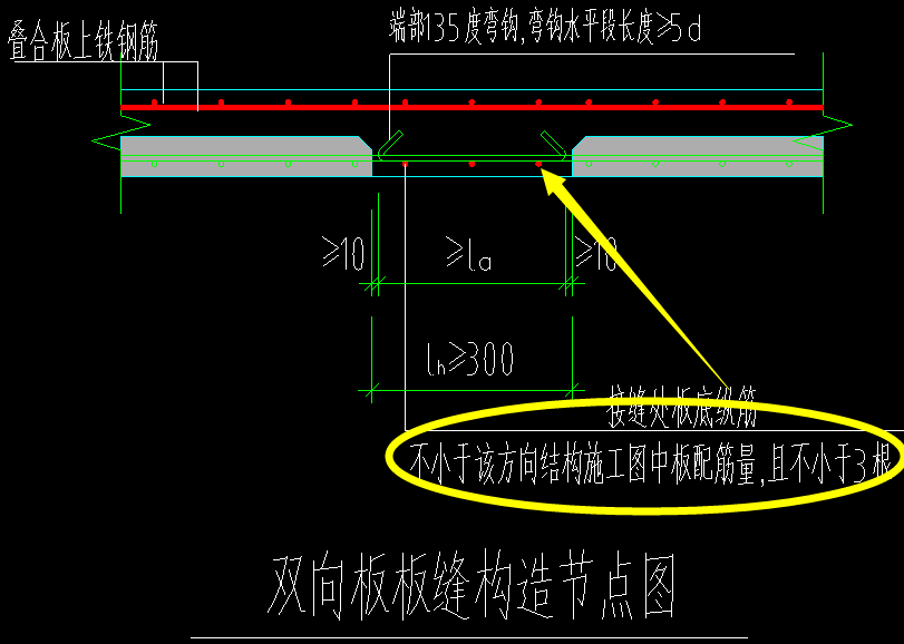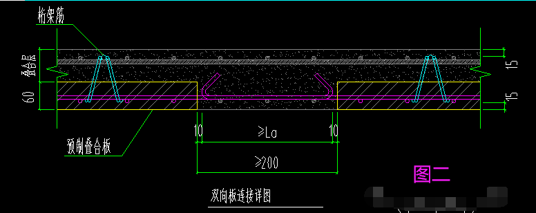预制板间的板缝为现浇,板缝钢筋为现场绑扎。上图二中板缝宽≥200(具体宽度看“水平向预制构件平面布置图”),无板缝钢筋(板缝处粉色钢筋为预制板出筋)。而图三中板缝钢筋为箭头所指的三根钢筋,配筋同同向预制板筋。