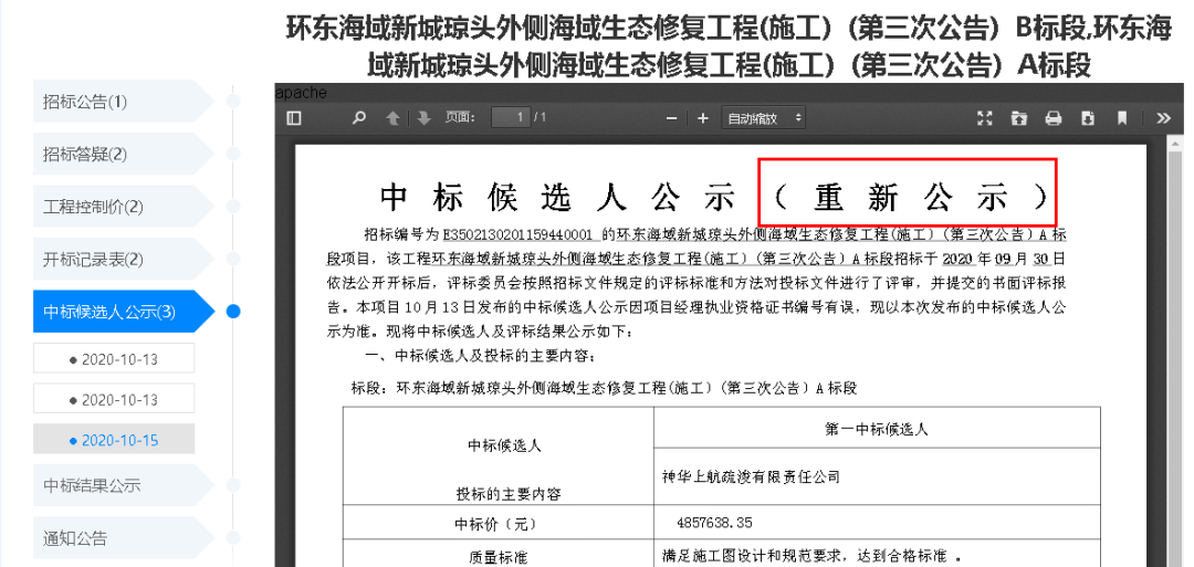 2020年10月公示的环东海域新城琼头外侧海域生态修复工程(施工)(第三次公告)施工招标,其A标段招标控制价为48332万元,而中标单位的中标价仅为485万元。