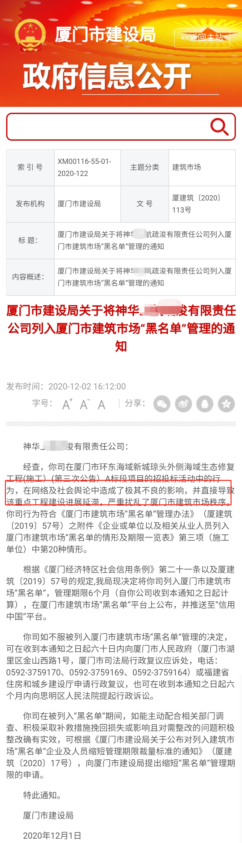 2021年4月22日厦门市建设局官网通报,将湖北XX工程有限公司列入厦门市建筑市场“黑名单”。