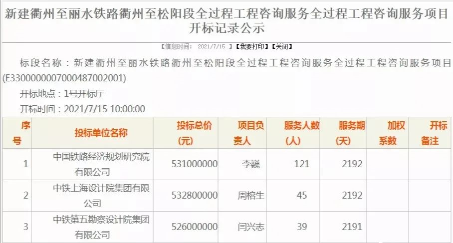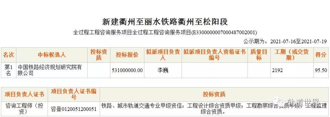 通过上图可以看到,该项目是新建衢州至丽水铁路衢州至松阳段全过程工程咨询服务;中标单位:中国铁路经济规划研究院有限公司;中标价:5.3亿;