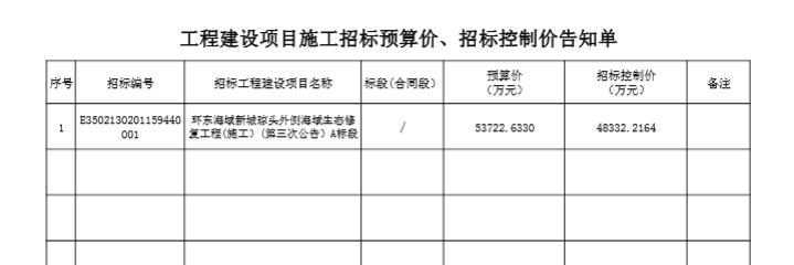 2020年10月公示的环东海域新城琼头外侧海域生态修复工程(施工)(第三次公告)施工招标,其A标段招标控制价为48332万元,而中标单位的中标价仅为485万元。
