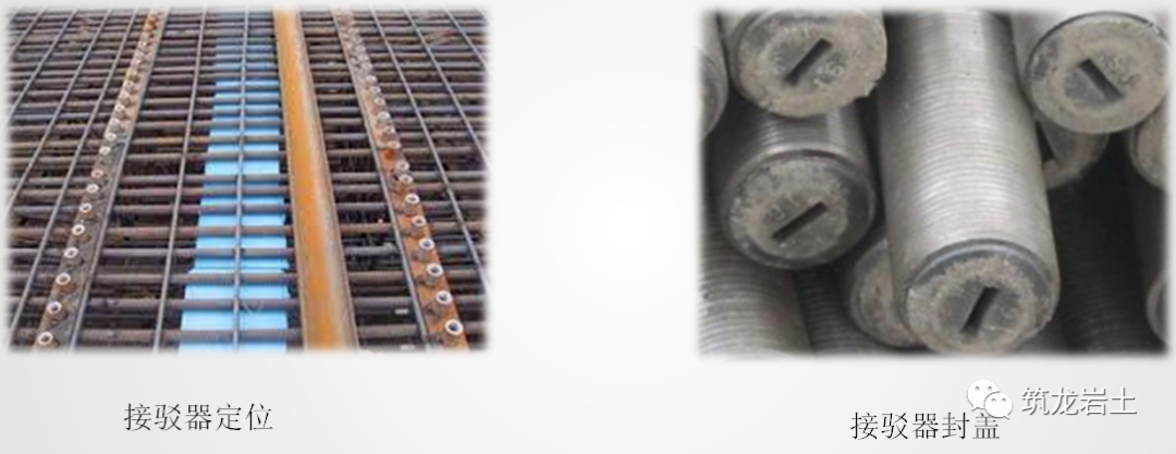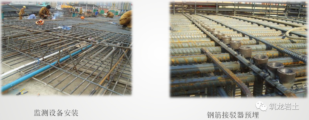 ◆ 监测所需预埋的如测斜管、声测管、土压力计等设备在地连墙钢筋笼制作时进行合理布设,避免与后续混凝土导管冲突,所有外露的缆线必须穿设套管固定并包裹严密,防止在钢筋笼吊装、浇筑砼过程中产生移位、管内进浆导致监测工作无法进行。◆地下连续墙的钢筋接驳器是连续墙钢筋施工的同时,根据以后地下结构楼板的标高要求,为以后地下连续墙和楼板整体连接而预埋在地下连续墙钢筋笼上的接驳件,基坑开挖后,预埋的接驳器普遍存在接驳器锈蚀、丝牙破坏、方位角偏差大造成接驳器和结构主筋无法连接、拧不到位、连接困难等状况,造成部分接驳器无法和主体结构的钢筋连接,影响结构墙板的整体性,常常需要另行植筋再连接。