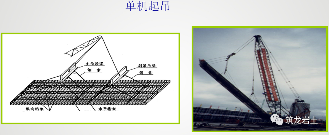 钢筋笼的起吊通常采用履带式起重机进行,因为钢笼起吊后,起重机需要将垂直吊起的钢笼运输至孔口进行下放。钢筋笼的起吊与安放应根据其重量与长度,选择匹配的吊车,一般采用单机起吊和双机抬吊方式,由专人统一指挥。入槽时应徐徐下降、平稳入槽,不得强行快速下放,入槽后应根据测定的导墙高程准确控制笼顶标高。
