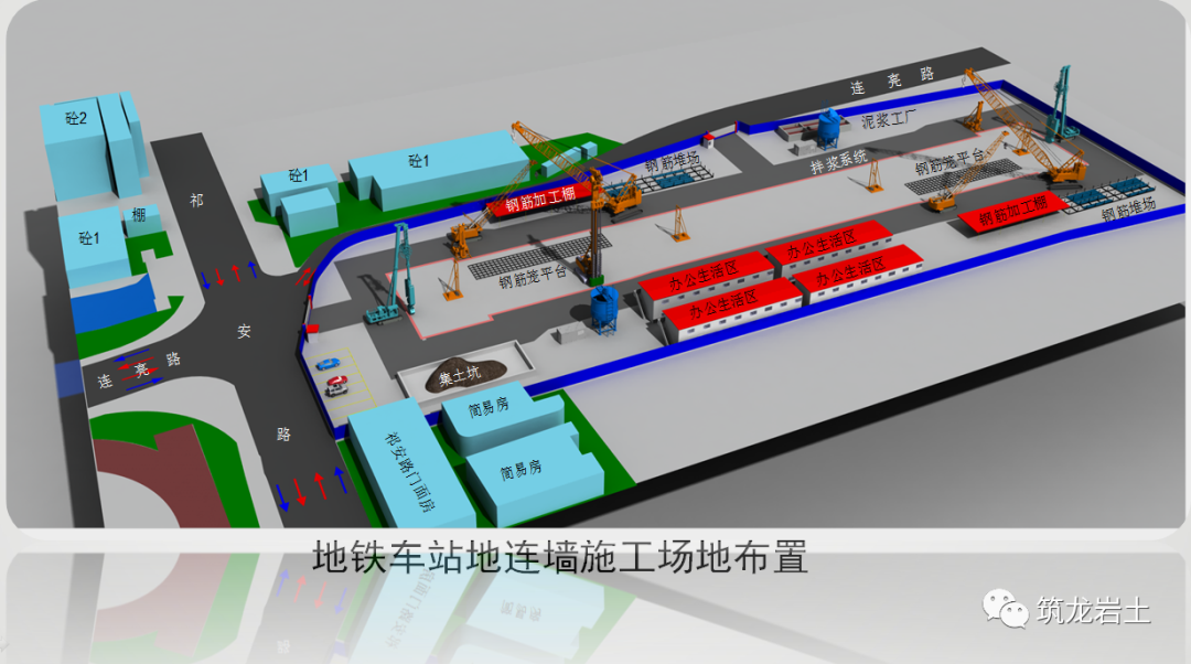 为了尽量减少泥浆系统的占地面积,采用泥浆筒仓与现筑泥浆池相结合的泥浆系统,泥浆的拌制、筛滤和循环主要在泥浆池中完成,储存主要靠泥浆筒仓。泥浆筒仓分为 2 个相互不联通的系统,筒仓组 A 存放成槽泥浆,筒仓组B 储存的泥浆专门用于清底换浆。地连墙钢筋笼加工区原则上设立在地连墙成槽区附近,便于钢筋笼的运输和安装。加工场地在压实原地面的基础上,铺设碎石,浇筑混凝土面层。加工场地尺寸按照最长幅段钢筋笼尺寸设置,钢筋笼以单元槽段为单位整体加工,场地能同时加工两个槽段的钢筋笼。在钢筋加工场地附近设置原材料存放区、半成品加工区、钢筋笼堆放区。