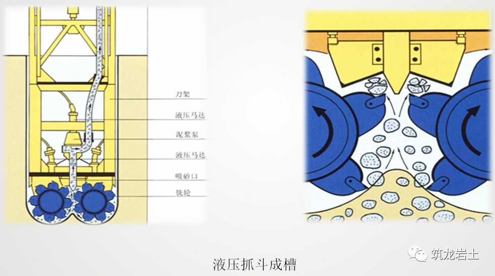 换用铣槽机成槽时首先用较快的铣削速度将抓斗已经挖好的孔重新再铣一遍,修复抓斗成槽槽段;遇到岩层后降低铣削速度,完成岩层的成槽。双轮铣槽机工作原理为反向循环原理。挖掘时两个铣轮连续 的切削下面的泥土和岩石然后把它们卷上来并破碎成小块,再在槽中与稳定的泥浆混合后将它们 吸进泵里面。装在真空盒上面的离心泵,将这些含有碎块的泥浆泵进一个循环设备,在那里通过 一个振动系统 ,将泥土和岩石碎块自泥浆中分离,处理后干净的泥浆重新抽回槽中循环使用。
