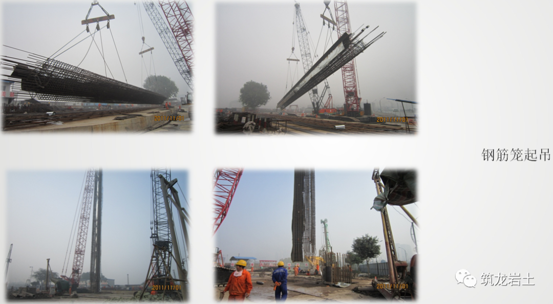 ⑴ 吊装钢筋笼前,吊装前施工方案必须进过专家论证,应对钢筋笼进行“质量三检”,并填写“隐蔽工程验收单”,请监理验收签证,否则,不能进行吊装作业。⑵ 吊装钢筋笼前,应搞清开挖面方向,因为开挖面与临土面的配筋往往是不对称的,如搞错,则受力条件完全相反了。⑶ 如果用履带式起重机长距离吊运钢筋笼,钢筋笼必须呈垂直悬空状态。⑷吊装拐角形钢筋笼时,应设置“人字形”桁架,并增加一些特殊的斜拉杆加强其刚度,防止钢筋笼变形,待钢筋笼下槽时,再渐次拆除。钢筋笼制作完成后在起吊前检查所有埋设的埋件、钢筋接驳器的数量和位置以及监测设备安装是否准确,符合质量标准要求后方能起吊入槽。在钢筋笼吊放前要再次复核导墙上4个支点的标高,精确计算吊筋长度,保证钢筋笼位置的准确。在钢筋笼下放到位后,由于吊点位置与测点不完全一致,吊筋会拉长等,会影响钢筋笼的标高,应立即用水准仪测量钢筋笼的笼顶标高,根据实际情况进行调整,将笼顶标高调整至设计标高。