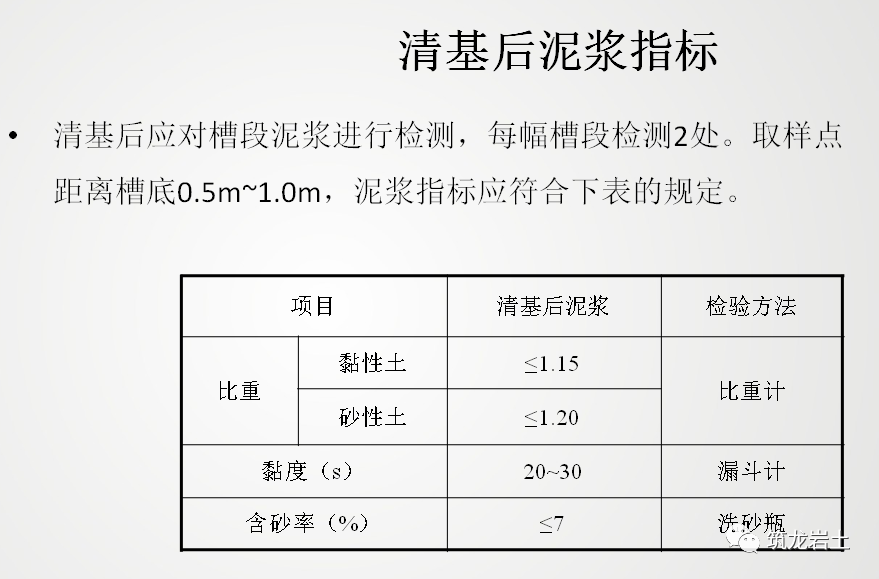 1、成槽后,应对相邻段混凝土的端面进行清刷,刷壁应到底部,刷壁次数不得少于20次,且刷壁器上无泥。3、 清基宜采用泵吸法使槽底沉渣及泥浆指标满足要求为止。