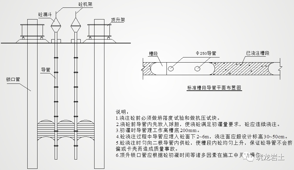 1、导管宜采用直径为200mm~300mm的多节钢管,管节连接应密封、牢固,施工前应试拼并进行水密性试验。2、导管水平布置距离不应大于3m,距槽段两侧端部不应大于1.5m。导管下端距离槽底宜为300mm~500mm。导管内应放置隔水栓。1)钢筋笼吊放就位后应及时灌注混凝土,间隔不宜超过4h。2)混凝土初灌后,混凝土中导管埋深应大于500mm。3)混凝土浇筑应均匀连续,间隔时间不宜超过30min。4)槽内混凝土面上升速度不宜小于3m/h,同时不宜大于5m/h;导管混凝土埋入混凝土深度应为2m~4m,相邻两导管间混凝土高差应小于0.5m。5)混凝土浇筑面宜高出设计标高300mm~500mm,凿去浮浆后的墙顶标高和墙体混凝土强度应满足设计要求。4、墙顶落低3m以上的地下连续墙,墙顶设计标高以上宜采用低强度等级混凝土或水泥砂浆隔幅填充,其余槽段采用砂土填实。为了满足第一次浇筑导管的埋深及后续混凝土浇筑的连续,必须保证混凝土的供应,第一批 最少进场6车混凝土(90m³)方可开始浇筑,浇筑过程对称浇筑。槽孔浇筑导管间距不大于3m,槽段布置两根导管(特殊槽布置三套导管),各导管均匀进料,混凝土面高差不大于0.5m,导管埋深不得小于2m,不宜超过6m。浇筑过程中根据浇筑方量计算情况,每30min测槽内混凝土面,测点设置在两导管间及槽孔两端头。浇筑时同步测