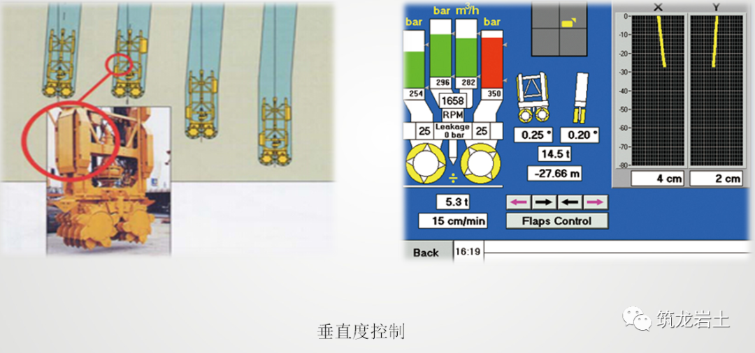 成槽过程中通过铣头上的传感器采集各类数据,分析双轮铣槽机的工作状态(铣头的偏直状况、铣削的深度、铣头受到的阻力),并进行相应的操作。根据不同土层设置铣头的下降速度,通过控制铣头所受的压力来减少刮刀的磨损,并加快成槽速度。当铣削硬土层时,铣头的下降速度要放慢(避免铣头底部的轮轴受到过大的压力而造成硬石损坏轮轴上刮刀的合金部分),并作上下小幅运动,让铣轮上刮刀的合金部分能有效地铣削硬土层,破碎的石块能尽快地被吸走。在地层多变地区,铣头在铣削时往往会使前后、左右的刮刀产生受力不同的情况,造成铣头倾斜,从而引起槽孔的偏斜。此时,操作员需要及时通过控制液压千斤顶系统伸出或缩回安装在左右导向板和前后的纠偏板,调整铣头的姿态,并调慢铣头下降速度,从而有效地控制槽孔的垂直度。