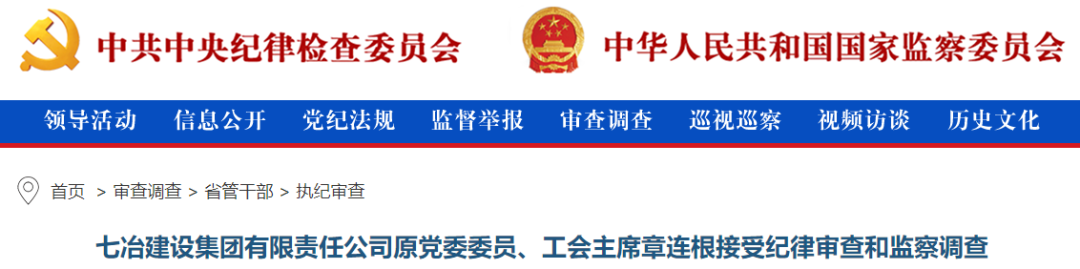 七冶建设集团有限责任公司原党委委员、工会主席章连根接受纪律审查和监察调查据贵州省纪委监委消息:七冶建设集团有限责任公司原党委委员、工会主席章连根涉嫌严重违纪违法,目前正接受贵州省纪委监委纪律审查和监察调查。