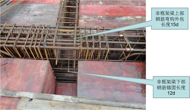 4)非框架梁(不含弧形梁)下部筋进入支座总长。