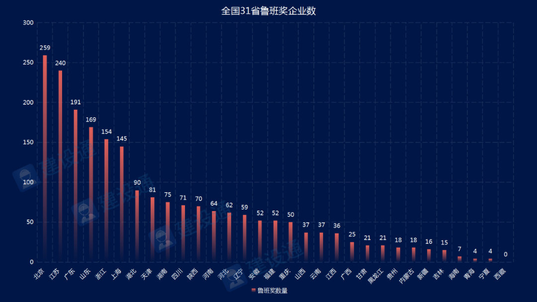 在全国31省中,北京市获得鲁班奖企业数为259家,位居第一;江苏省获得鲁班奖企业数为240家,位居第二;广东省获得鲁班奖企业数为191家,位居第三。