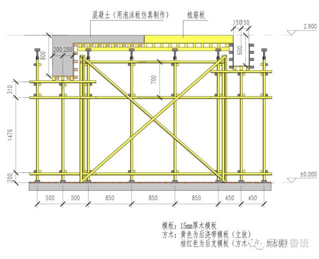 第一道水平杆(扫地杆)距地200mm,板模板采用U型支托,混凝土采用泡沫板仿真制作,另一半设置梳筋板。