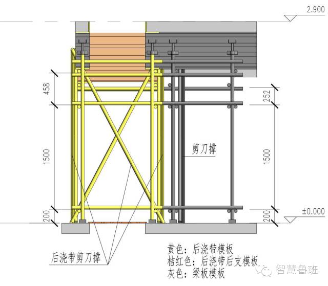 图示按不同的颜色区分:灰色为梁板模板,可以先拆,黄色为后浇带模板,是一个独立的支撑体系,桔红色是后支部分,在后浇带清理剔凿完成后支设,以下是详细做法: