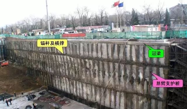 桩顶不设锚桩、拉杆,而是挖至一定深度,每隔一定距离向桩背面斜向打入锚杆,达到强度后,安上横撑,拉紧固定,在桩中间挖土,直至设计深度适于大型较深基坑,施工期较长,邻近有建筑物,不允许支护、邻近地基不允许有下沉位移时使用。
