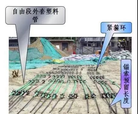 包括下料、除锈防腐、焊接导向锥、绑扎、入孔六个步骤。拉杆常用钢管、粗钢筋或钢丝束、钢绞线制成的锚索。锚索预留长度为1- 1.5m,锚固段间隔1-2m设置隔离架和紧箍环,中心布置灌浆管;自由段外套塑料管,前端切实做好隔浆措施。