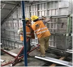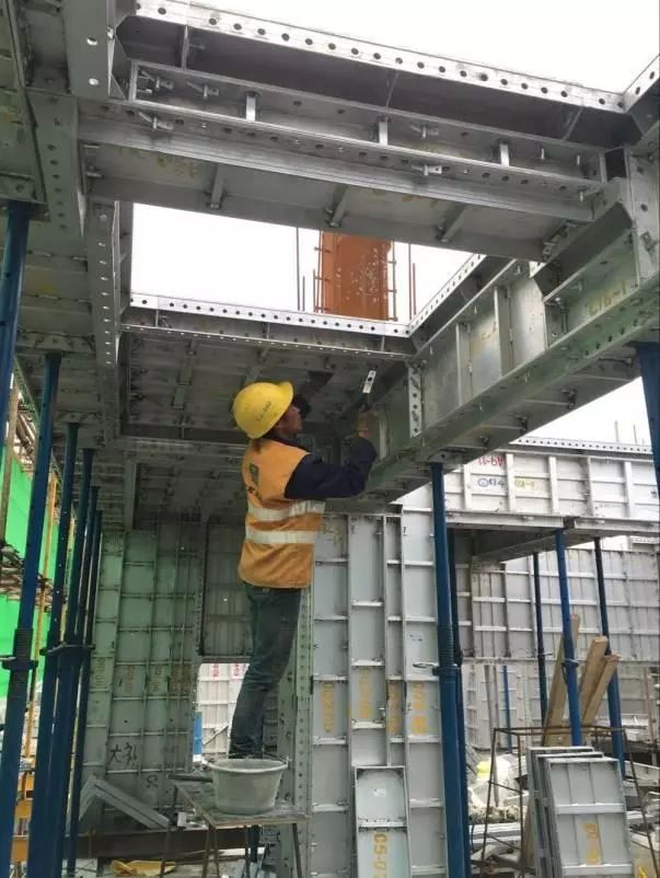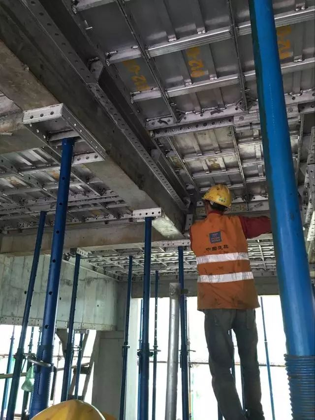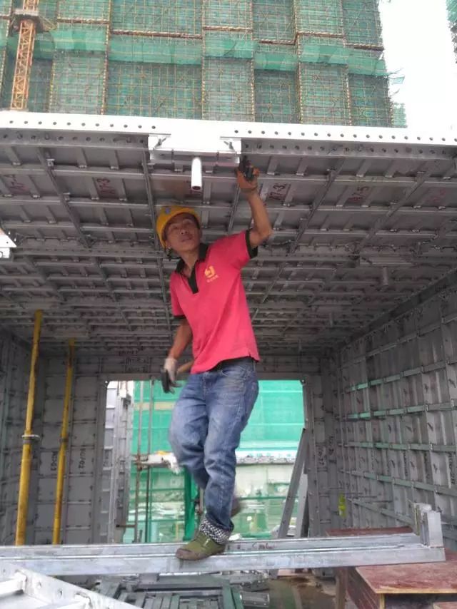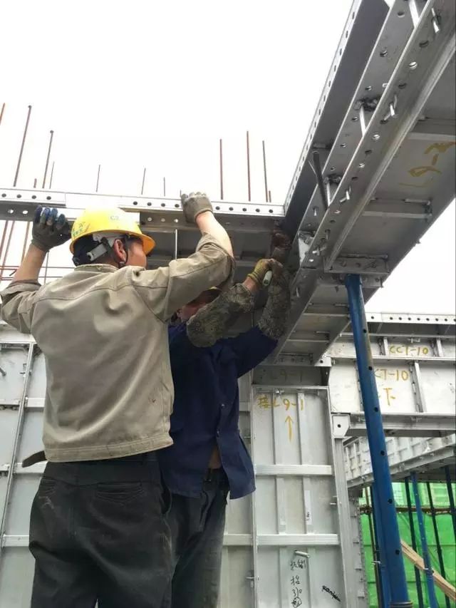 楼面对角线检查无误时,开始安装楼面模板,为了安装快捷,楼面模板要平行逐件排放,先用销子临时固定,最后统一打紧销子。