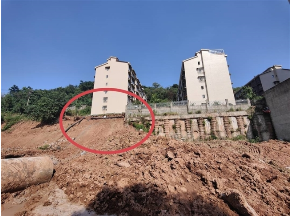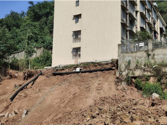 “我们小区七号楼西边平台外和斜坡处发生垮塌滑坡。”8月3日上午,南充市高坪区御景湾小区业主李先生向媒体反映,小区七号楼下西面的地基和平台2日晚到3日凌晨发生2次垮塌,导致楼底围墙、防护栏和一个约5米长的绿化平台垮塌,“排污管道等也断了,现在地基直接暴露在外,有些地基还处于悬空状态,很危险。”