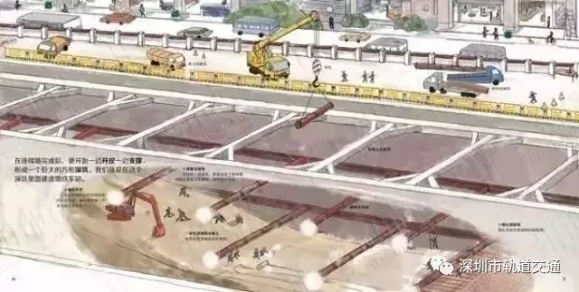 在连续墙完成后,便开始一边开挖一边支撑,形成一个巨大的方形深坑。我们就是在这个深坑里面建造地铁车站。