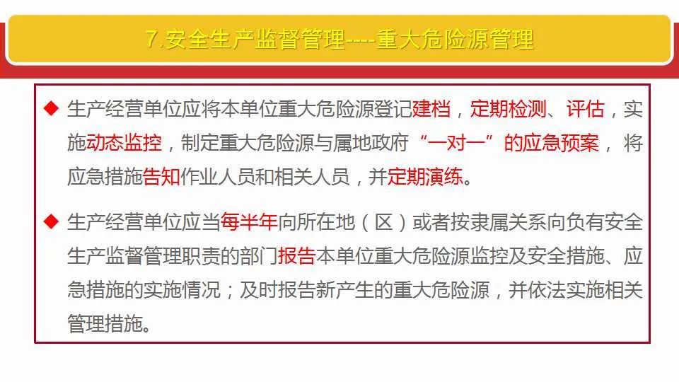 企业应对重大危险源进行登记和建档,采用先进技术手段对重大危险源实施现场动态监控,定期检测评估,制定应急预案,完善控制措施,按照有关规定建立健全安全监测监控系统并与负有安全生产监督管理职责的部门进行联网。对具有较大或以上危险因素的生产经营场所和有关设施设备,应建立运行、巡检、维修、保养的专项安全管理制度,安排专人负责管理,并设置明显的安全警示标志和事故应急处置卡,配备消防、防雷、通讯、照明等应急器材和设施,根据生产经营设施的承载负荷或者生产经营场所核定的人数控制人员进入。定期组织对安全设施设备进行体检式安全评估,确保始终处于安全可靠状态。