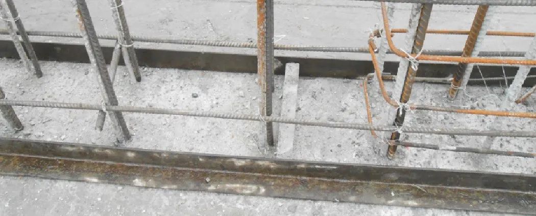 5. 夹档放置混凝土撑块:角钢体系固定完成后,随即在两侧角钢夹档之间放置混凝土撑块,以保证合模加固时,下脚根部受力合理,防止角钢向剪力墙、框柱钢筋部位偏移,以防露筋并保证结构截面尺寸。