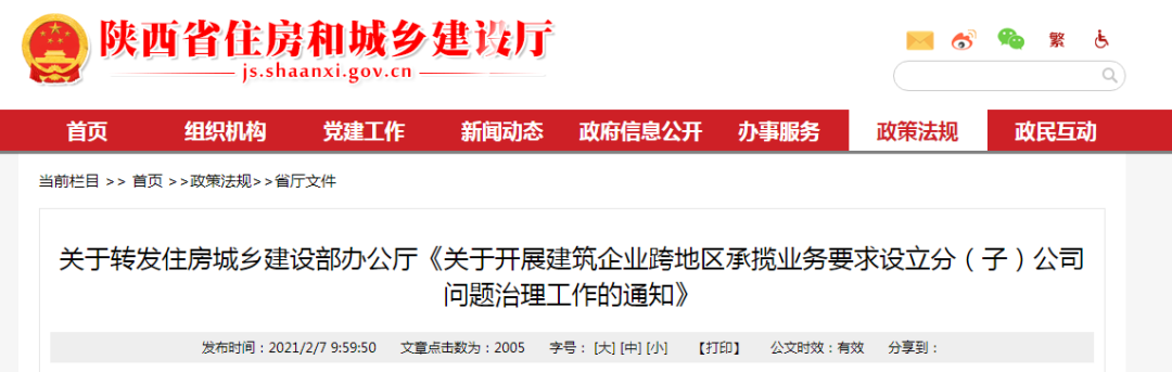 2021年2月,陕西省住建厅转发住房城乡建设部办公厅《关于开展建筑企业跨地区承揽业务要求设立分(子)公司问题治理工作的通知》。