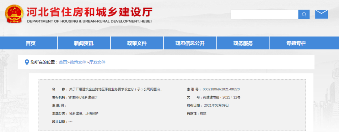 2021年2月,河北省住建厅下发通知,决定开展建筑企业跨地区承揽业务要求设立分(子)公司问题治理。