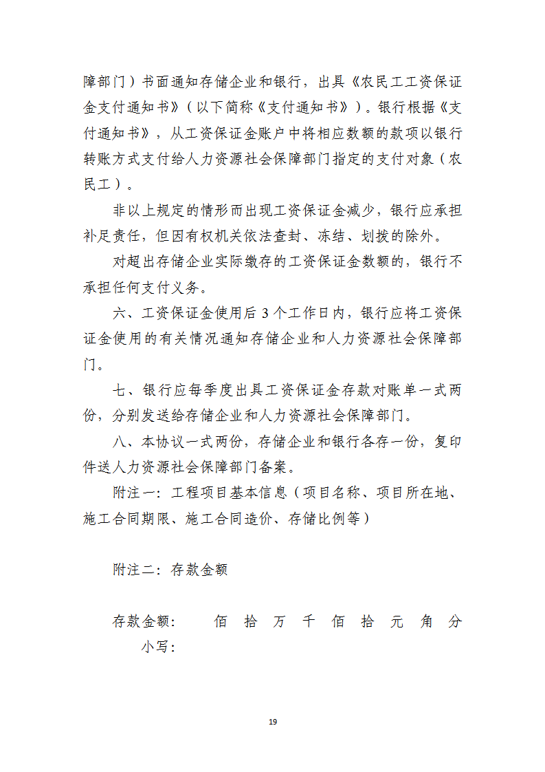 第九条 存储工资保证金的施工总承包单位应与经办银行签订《农民工工资保证金存款协议书》(附件1),并将协议书副本送属地人力资源社会保障行政部门备案。