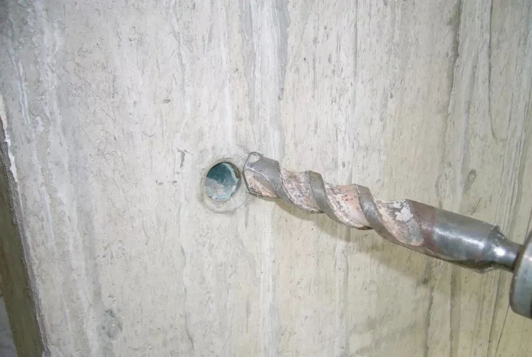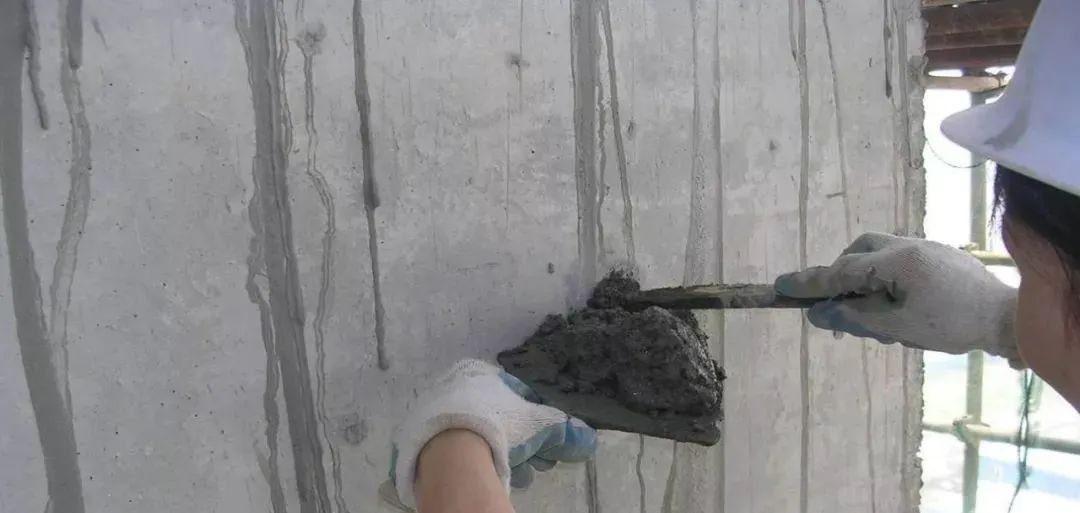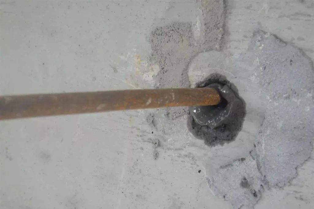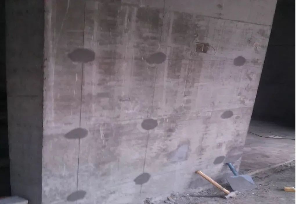6、结构内墙面螺杆眼孔洞处理同外墙,先将螺杆眼凿出15mm深,直径30mm的喇叭形,灌1:3水泥砂浆。操作时,等先封堵的一头砂浆凝固后方可灌浆封堵另一头。