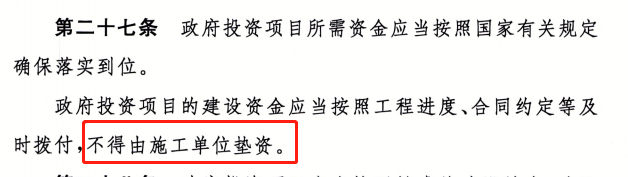 1、禁止“垫资施工”:政府投资项目不得由施工单位垫资建设。