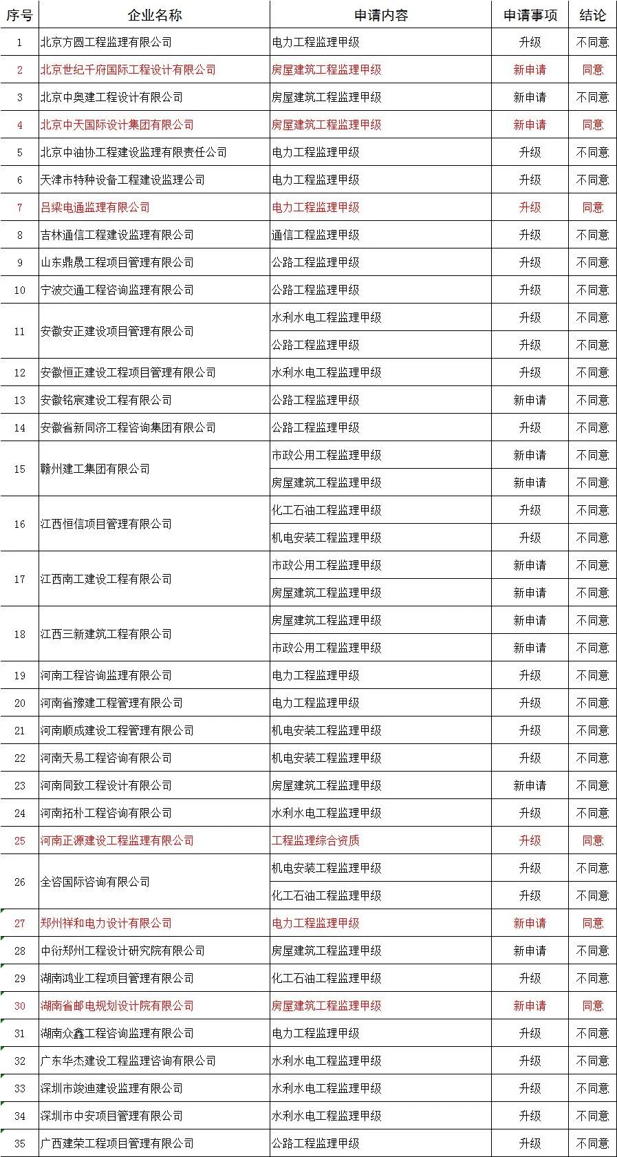 | 10 | 北京石油化工工程有限公司 | 石油化工工程施工总承包壹级 | 新申请 | 不同意 |