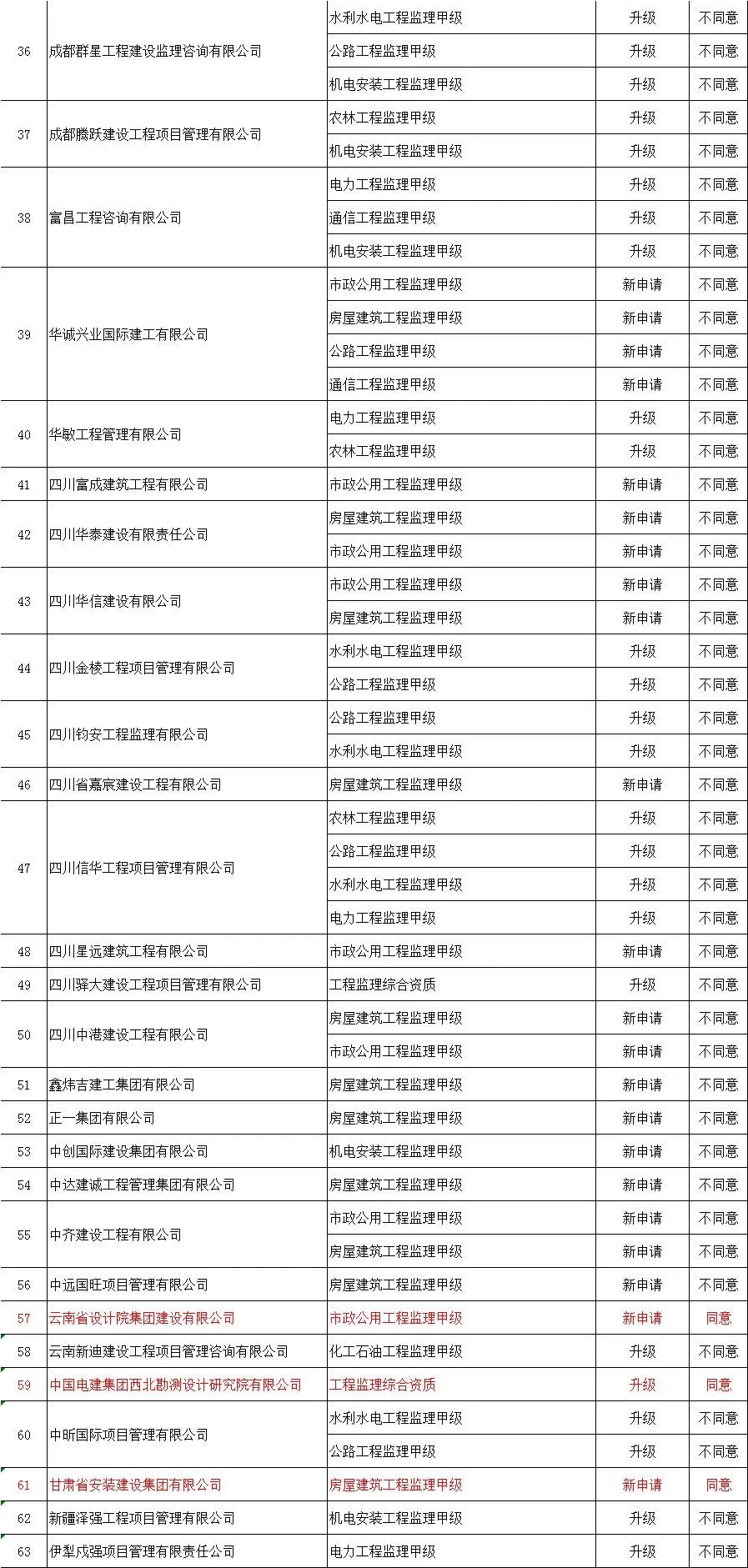 | 278 | 四川同达建设有限公司 | 电力工程施工总承包壹级 | 升级 | 不同意 |