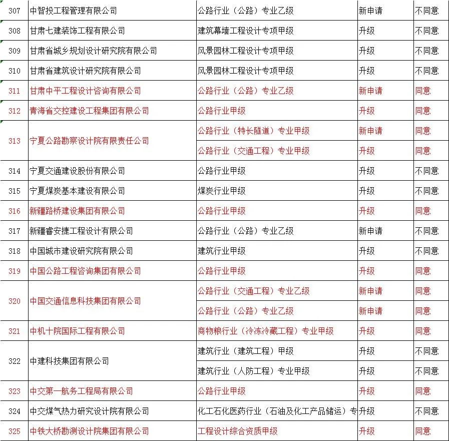 | 353 | 中北交通建设集团有限公司 | 公路工程施工总承包特级 | 升级 | 同意 |
