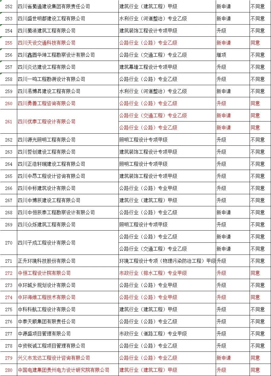 | 281 | 四川欣平建筑工程有限公司 | 公路工程施工总承包壹级 | 升级 | 不同意 |