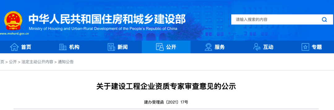 按照《行政许可法》及有关建设工程企业资质管理规定,我部对近期申请建设工程企业资质的申报材料组织了专家审查,现将专家审查意见在住房城乡建设部门户网站(http://www.mohurd.gov.cn)予以公示,以广泛接受社会监督。企业申报材料中的人员、代表工程业绩等详细情况,可通过点击“住房城乡建设部网站主页→建设工程企业资质行政审批专栏→资质申报基本信息公示”进行查询。