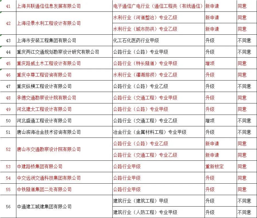 | 377 | 中交第一航务工程局有限公司 | 公路工程施工总承包特级 | 升级 | 同意 |