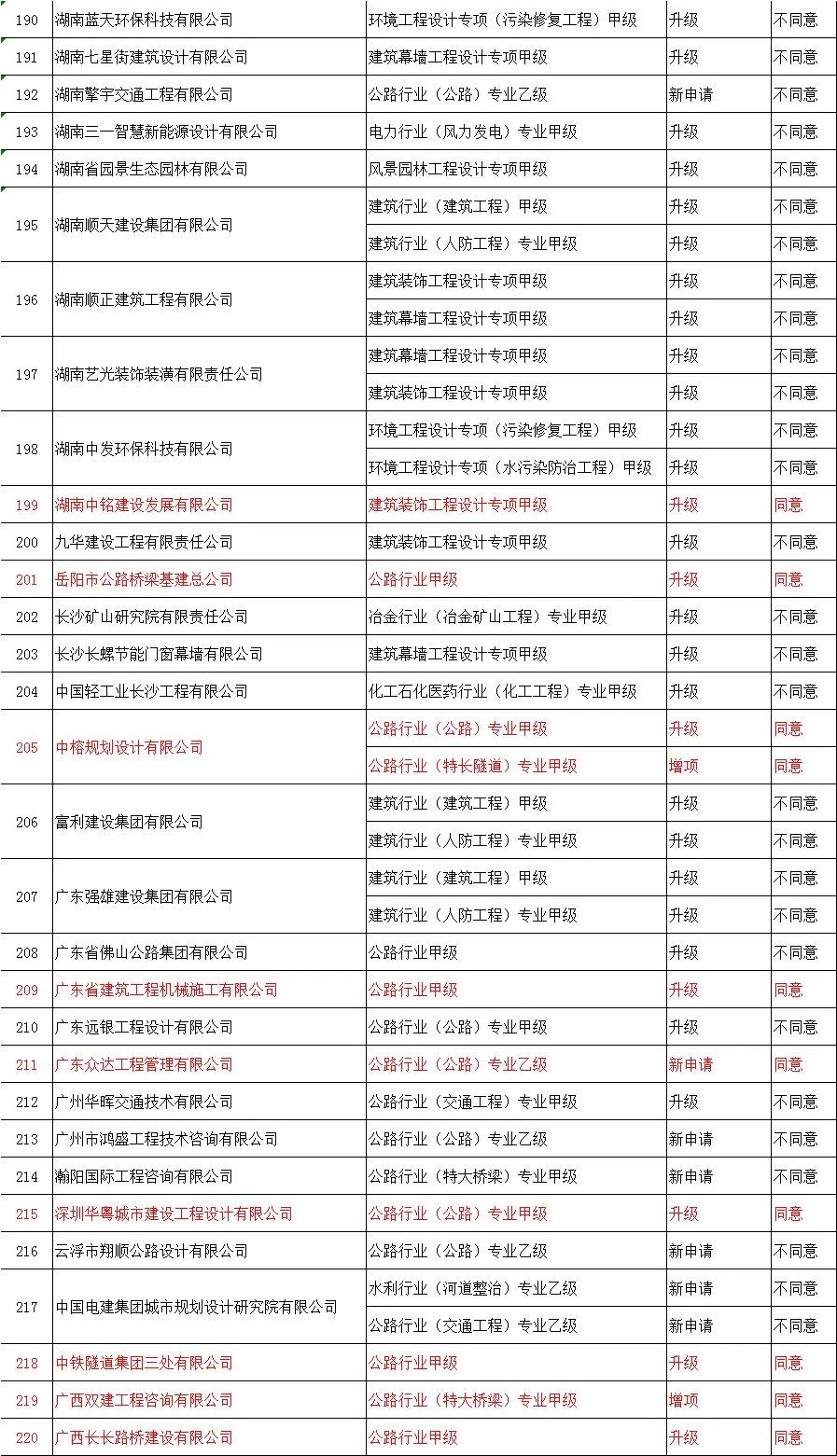 | 205 | 湖南顺天建设集团有限公司 | 建筑工程施工总承包特级 | 升级 | 不同意 |