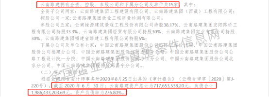 根据云南精合会计师事务所2020年8月25日出具的《审计报告》(云精合审字[2020]第J-220号),截至 2020 年 6 月 30 日:云南路建资产总计为717,653,538.20元,负债合计1,986,433,203.69元,资产负债率为276.80%。