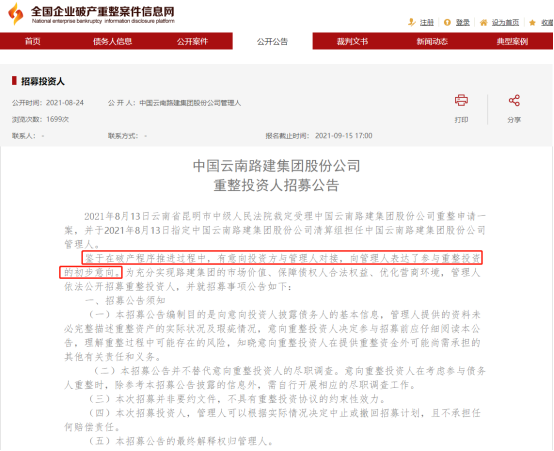 尽管云南路建集团8月13日才被裁定受理破产重整,但招募重整投资人节奏快,行动迅速,报名仅截至9月15日。
