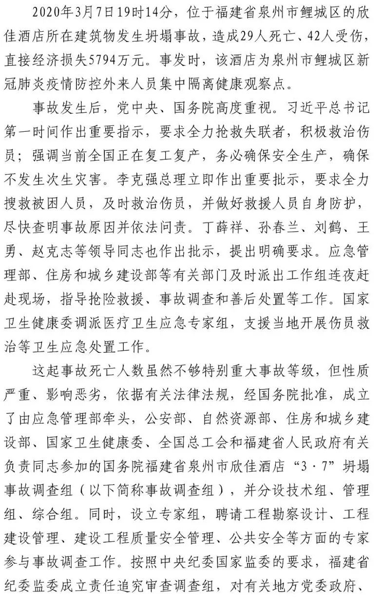 经福建省委批准、中央纪委国家监委同意,福建省纪委监委已对事故中涉嫌违纪、职务违法、职务犯罪的49名公职人员严肃追责问责。