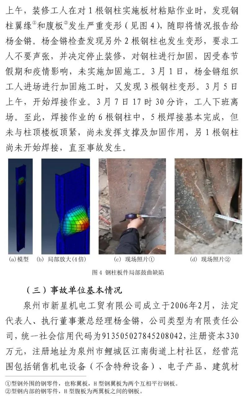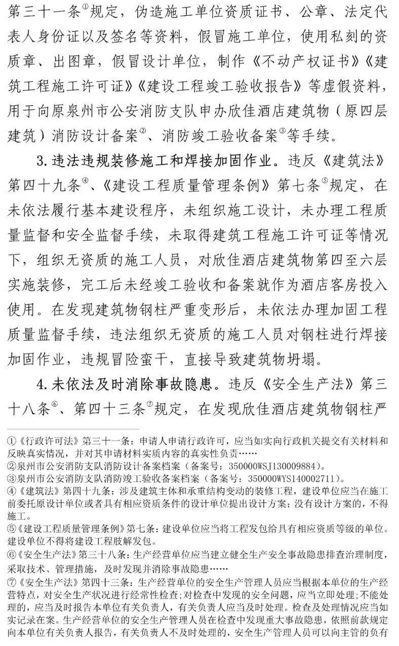 事故责任单位泉州市新星机电工贸有限公司将欣佳酒店建筑物由原四层违法增加夹层改建成七层,达到极限承载能力并处于坍塌临界状态,加之事发前对底层支承钢柱违规加固焊接作业引发钢柱失稳破坏,导致建筑物整体坍塌。