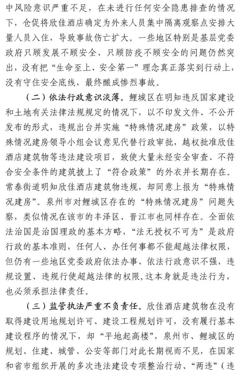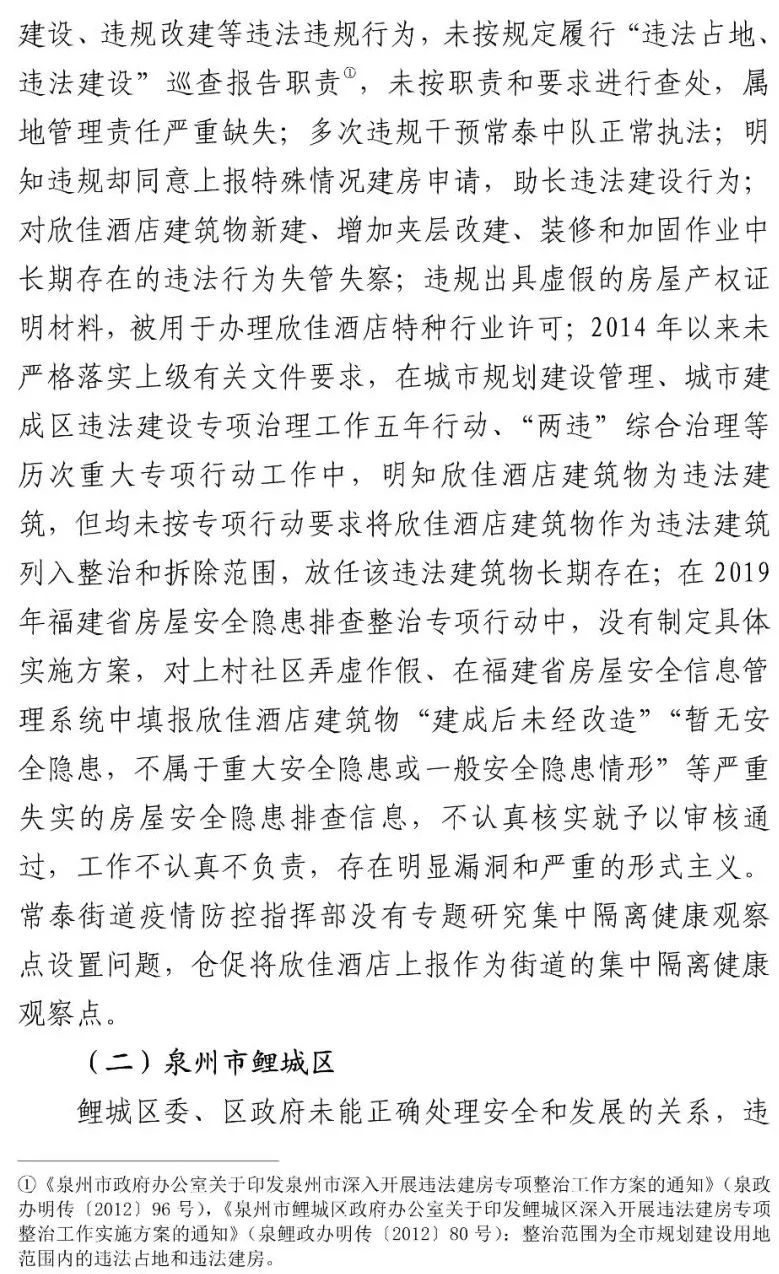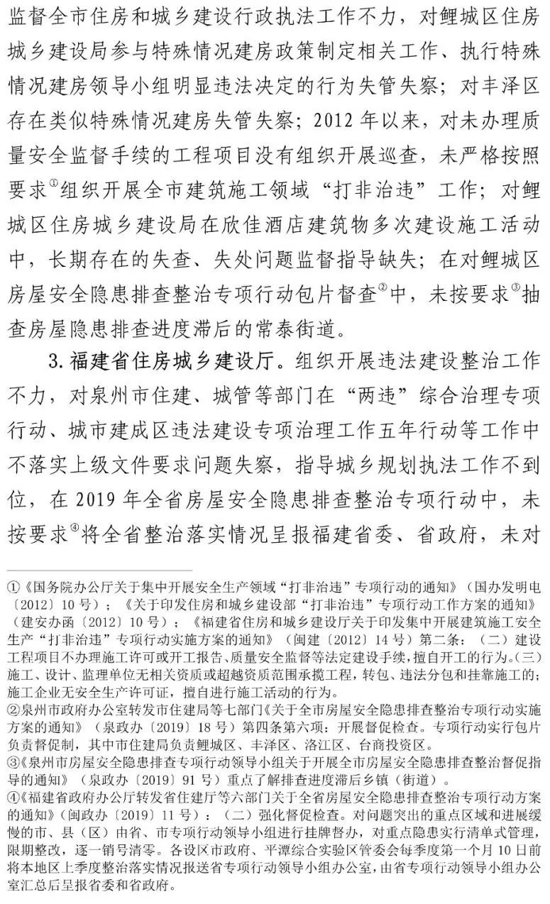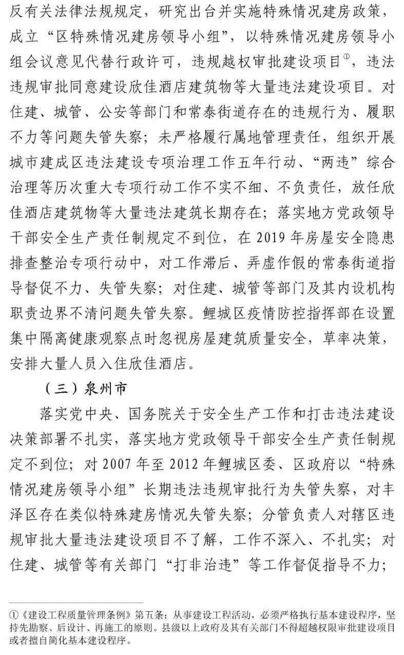 泉州市各级住建部门对建筑活动和工程质量负有监管主体责任,但对于欣佳酒店建筑的长期违法违规行为从未发现和查处。