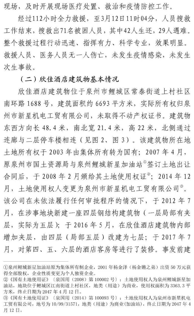 2020年3月7日,位于泉州市鲤城区常泰街道上村社区南环路1688号的欣佳酒店所在建筑物发生坍塌事故,坍塌的建筑物系泉州市新星机电工贸有限公司综合楼,因长期违法违规建设、改建和加固施工导致坍塌,造成29人死亡、50人不同程度受伤,直接经济损失5794万元。