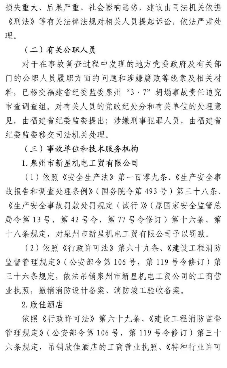 泉州市新星机电工贸有限公司法定代表人杨金锵、泉州市广鑫建设工程公司法定代表人蔡条辉等23名相关责任人员被公安机关依法立案侦查并采取刑事强制措施。