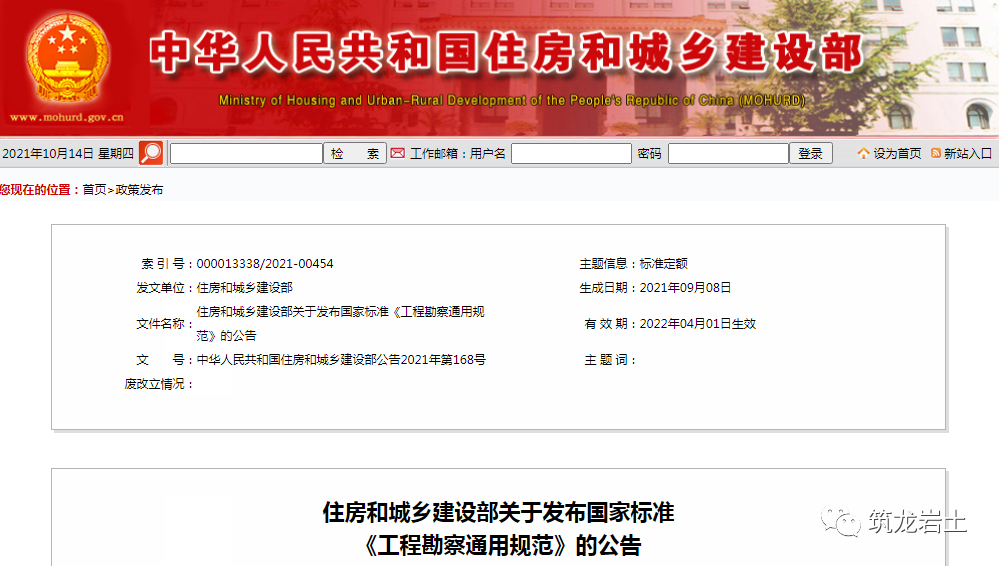现批准《工程勘察通用规范》为国家标准,编号为GB 55017-2021,自2022年4月1日起实施。本规范为强制性工程建设规范,全部条文必须严格执行。现行工程建设标准相关强制性条文同时废止。现行工程建设标准中有关规定与本规范不一致的,以本规范的规定为准。 本规范在住房和城乡建设部门户网站(www.mohurd.gov.cn)公开,并由住房和城乡建设部标准定额研究所组织中国建筑出版传媒有限公司出版发行。