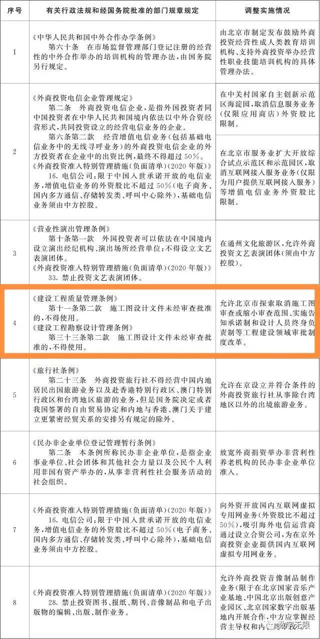 一、按照《深化北京市新一轮服务业扩大开放综合试点建设国家服务业扩大开放综合示范区工作方案》,同意自即日起在北京市暂时调整实施《中华人民共和国中外合作办学条例》、《外商投资电信企业管理规定》、《营业性演出管理条例》、《建设工程质量管理条例》、《建设工程勘察设计管理条例》、《旅行社条例》、《民办非企业单位登记管理暂行条例》、《外商投资准入特别管理措施(负面清单)(2020年版)》的有关规定(目录附后)。