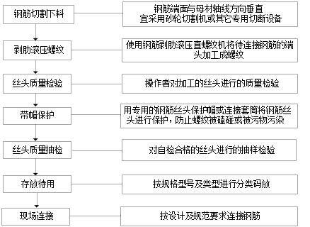 钢筋经专门的滚压机床对钢筋端部进行滚压,螺纹一次成型,然后利用扳手将两根钢筋的丝头拧进连接套筒。