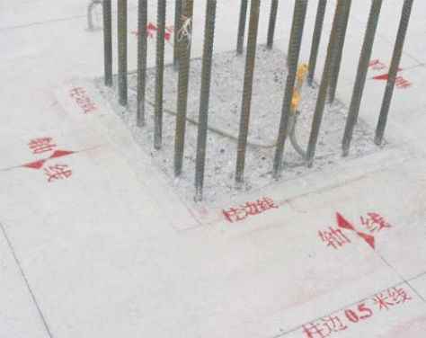 2)在底板混凝土上弹出肋板(立柱)位置线,再次校正预埋插筋,如有位移时,按洽商规定认真处理。